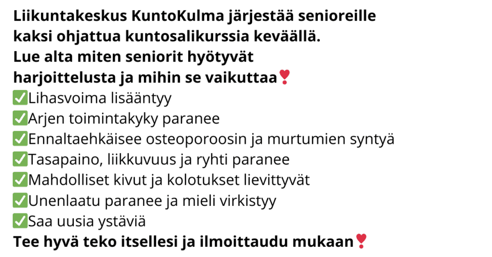 Kurssit alkavat ti 31.03 klo 12-13 tai ke 01.04 klo 13-14. Kurssi jatkuu 08.05 asti. Ilmoittaudu Tupu Ojanperälle 040 1399930. Hinta 48 €